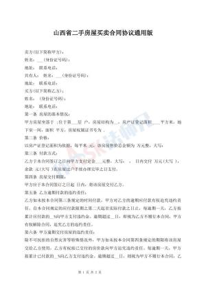 山西省二手房屋买卖合同协议通用版