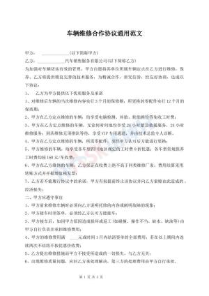 车辆维修合作协议通用范文